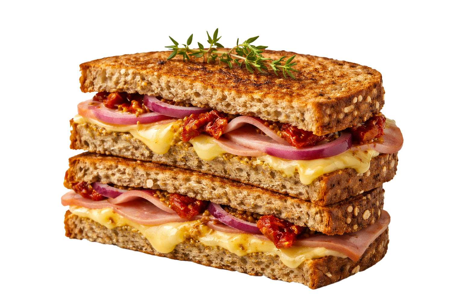 ingredienten: volkerenbrood, zongedrooogde, tomaten, olijfolie, tijm biologische, ham, kaas, rode ui en mosterd